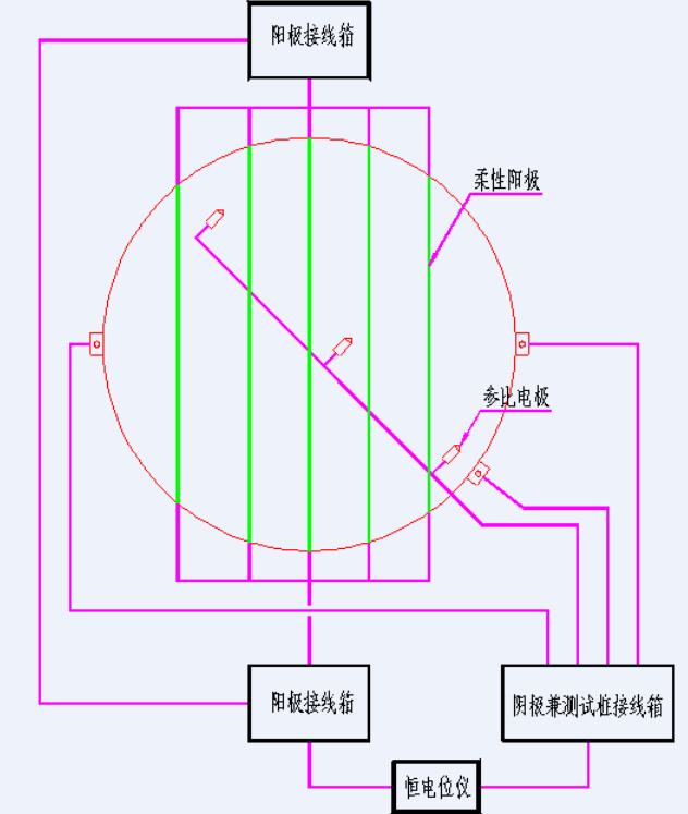 柔性陽極是整個(gè)陰極保護(hù)系統(tǒng)的核心部件,柔性陽極是一種線型的、柔韌的、碳基的陽極系統(tǒng),該系統(tǒng)安裝在管道、油罐或其它被保護(hù)結(jié)構(gòu)的附近,并連接到外接電源的正極上,而油罐、管道等被保護(hù)體則連接到外接電源的負(fù)極上,這樣,就形成一個(gè)回路。通電后,適量的陰極防護(hù)電流就可以通過導(dǎo)線均勻地分散到每一個(gè)部位,使被保護(hù)體得到完整的保護(hù)。