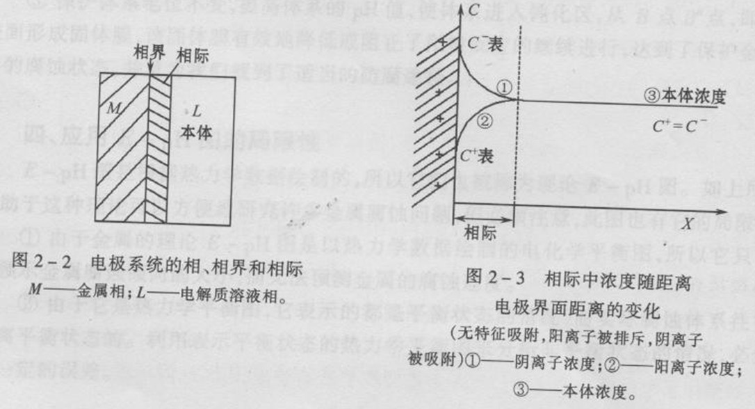 同樣,一個(gè)電極系統(tǒng),也存在界面和相際,如圖2-一2所示。相際內(nèi)溶液的性質(zhì)發(fā)生變化,例如溶液濃度與本體濃度不同。當(dāng)溶液中含有表面活性物質(zhì)時(shí),表面活性物質(zhì)的表面吸附使C表)C本體,如圖2-3所示。相際內(nèi)除了濃度隨著距離政變外,還有許多別的特征:例如各類雙電層電位差在相際建立;各類吸附現(xiàn)象在相際發(fā)生;大多數(shù)電化學(xué)反應(yīng)(電極反應(yīng))在相際進(jìn)行等。電極系統(tǒng)的各種特性都將在相際中充分反映出來(lái)。