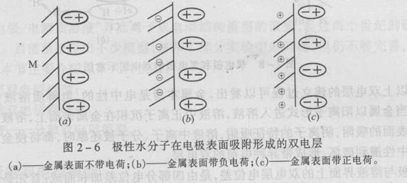 所示。極性水分子在界面的吸附取向受電極表面帶電狀態(tài)的影響。當(dāng)電極上不帶電荷時,水極性分子帶正電荷的一端朝向金屬電極。水的定向排列隨機(jī)性大t定向吸附能力最弱,無機(jī)陽離子及中性活性分子最易取代水分子吸附于電極表面。此時,由吸附水分子形成的雙電層電位差較小,如圖2 - 6(a)。如果電極表面帶過剩負(fù)電荷或正電荷,則促使水分子定向排列,雙電層電位差較大,如圖2- 6(b)、(c)